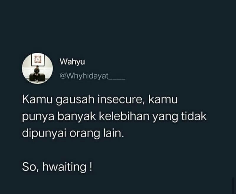 Mengetahui gimana diri kita, mengetahui semua kekurangan dan kelebihan. Tidak usah melihat segalanya yang ada di diri orang lain. The most important✨