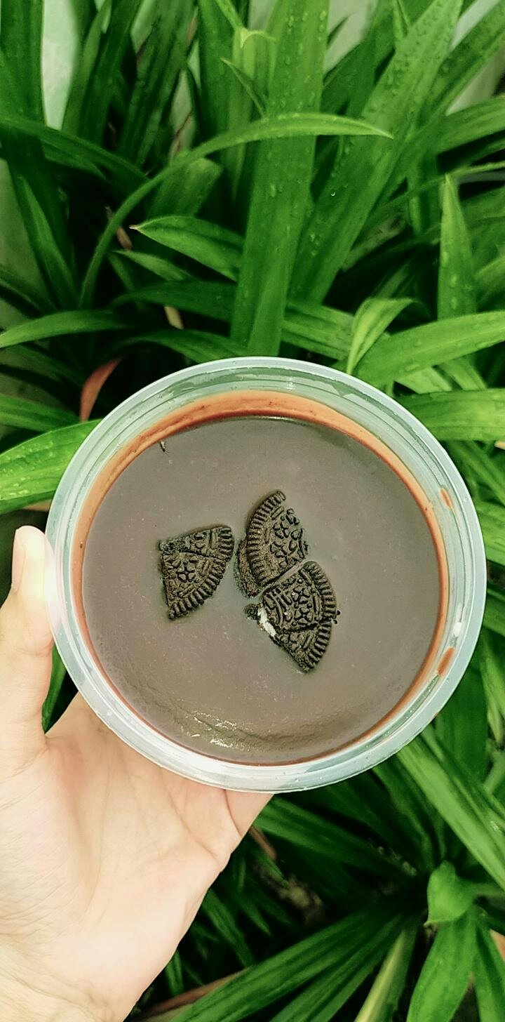 Lalu, Tuangkan Adonan tersebut ke dalam wadah yang sudah tedapat oreo dan masukkan ke dalam kulkas sebentar