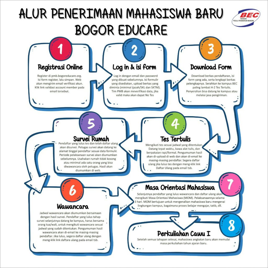 Setiap calon mahasiswa/i akan melalui tahap seleksi berupa test tulis, test wawancara dan survey rumah. Adapun berikut cara mendftar di Bogor EduCARE: